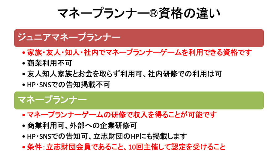 •家族・友人・知人・社内でマネープランナーゲームを利用できる資格です